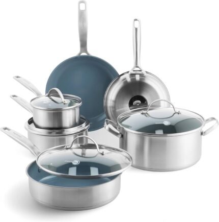 GreenPan Treviso 10 Piece Cookware Set, Non-Toxic PFAS-Free Stainless Steel Ceramic Nonstick Coating, Induction Suitable, Pots, Pans Lids, Sauté & Saucepans, Multi Clad, Dishwasher & Oven Safe