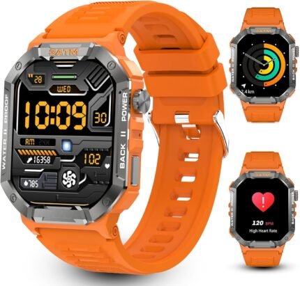Military Smart Watches for Men (Answer/Make Calls), 2.01″ UHD Fitness Watch with Heart Rate/Sleep Monitor/Blood Oxygen/100+ Sport Modes/IP68 Waterproof, Smartwatch for Android & iPhone, Orange