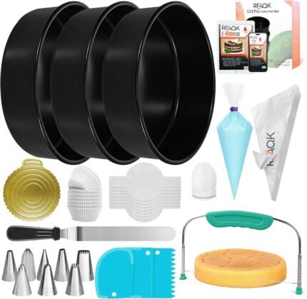 RICCLE 138PCs Round Cake Pans Sets for Baking, 3 x 8 Inch Pan Set, Piping Bags and Tips Set, Cake Leveler, Icing Spatula, Cupcake Liners, Baking Supplies, Decorating Kit, Baking Tools