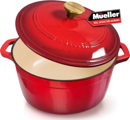 Mueller 6qt Enameled Cast Iron Dutch Oven, Heavy-Duty Casserole and Braiser Pan with Lid and Knob, Oven-Safe up to 500° F & Across All Cooktops, Red