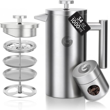 Coffee Gator 304 Grade Stainless Steel French Press Coffee Maker 34 oz, Double Wall Insulated Teapot with 4-Level Filtration System, Include Travel Jar Canister, Rust-Free, Dishwasher Safe, Silver