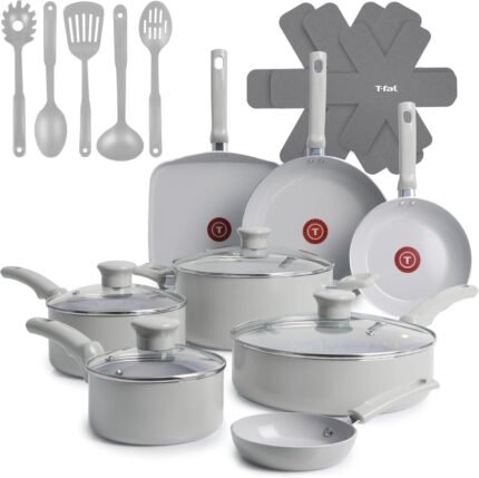 T-Fal Refresh Ceramic Pots and Pans Set, 20-Piece Nonstick Cookware Set, Stockpot, Griddle, Frying Pans, Utensils, Moon Grey