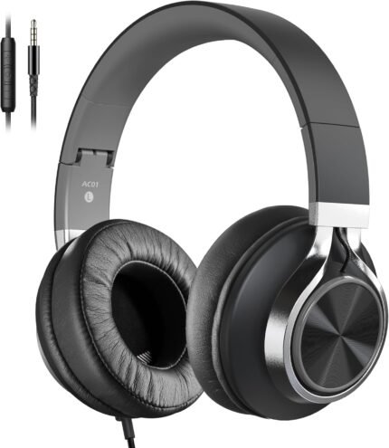 AC01 Headphones Wired Over Ear, Corded Stereo Headsets with Microphone Volume Control for Adults Teens Kids 3.5mm for Cellphones, Tablets, Laptop, Chromebook (Black Grey)