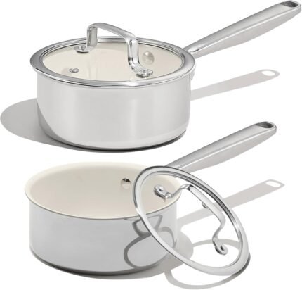 CAROTE 1.6Qt & 3Qt Stainless Steel Saucepan Set, Ceramic Pot Sets Non-Stick Non-Toxic Kitchen Cookware, Small Cooking Pots with Lids, Oven Safe, Induction Sauce Pan, Even Heating