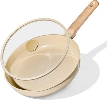 CAROTE 10″ Ceramic Frying Pan with Lid, Non Stick Frying Pan Skillet Chef’s Pan, Healthy & PFOA/PFAS Free, Induction-Compatible, Taupe