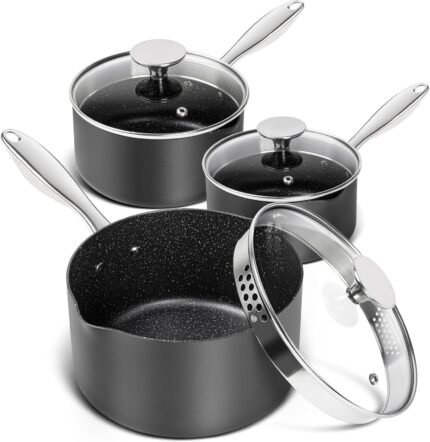 MICHELANGELO Hard Anodized Saucepan Set with Lids, Nonstick Saucepan with Pour Spouts & Strainer Lid for Easy Pour, Granite Derived Coating Sauce Pot Set – 1.5QT & 2QT &3QT Induction Sauce Pans