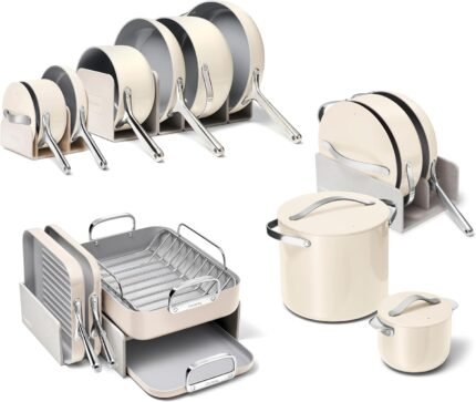 Caraway 31-Piece Ceramic Cookware Bundle – Fry Pans, Saucepans, Sauté Pan, Dutch Oven, Petite Cooker, Stir Fry, Rondeau, Stock Pot, Grill & Griddle Pans, Roasting Pan, Racks, Organizers – Cream
