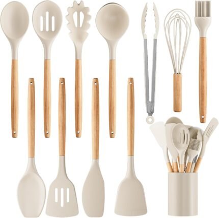 Silicone Cooking Utensil Set,12 PCS Cooking Cookware Kitchen Utensils Set for Cooking, Nonstick 446°F Heat-Resistant Cookware Kitchen Tools of Spoon,Brush,Whisk,Spatula,Turner Tongs (Khaki)
