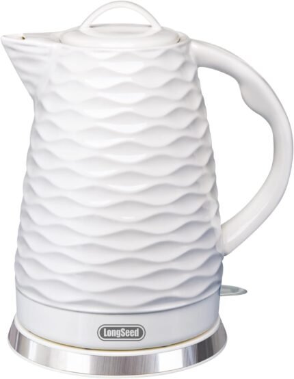 Longseed Ceramic electric kettle,1.5L/1000w, white electric tea kettle, Automatic Shut-Off, BPA-Free, Boil-Dry Protection, suitable for coffee, tea, quick boiling, with wave texture design