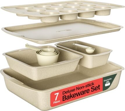 Stackable Baking Pan Set – Deluxe Nonstick White Marble Coating, Carbon Steel Bakeware Sets, PFOA, PFOS, PTFE Free, Recipe Booklet Included, Oven Safe (Up to 450°F), Set of 7 – White