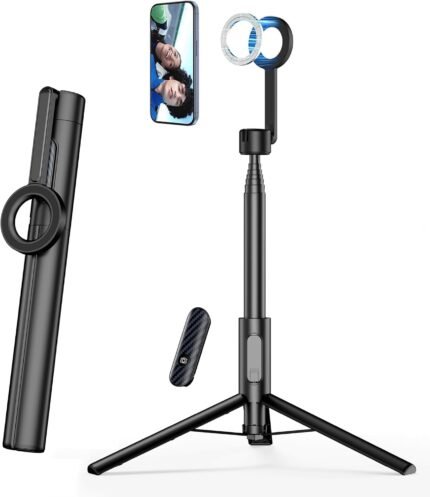 SEAJIC Magnetic Phone Tripod for iPhone 64″ Selfie Stick with Remote and Metal Ring, Automatic Pop-up MagSafe Travel Tripod for Cell Phone Video Recording/Photography/Vlogging (Balck)