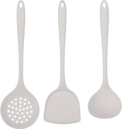 Silicone Kitchen Utensil Set – 3 Piece Cooking Tools (Spatula, Soup Ladle, Slotted Spoon) – Heat Resistant, Non-Scratch, Food Grade Silicone for Non-Stick Pots & Pans (White – 3 Pcs)