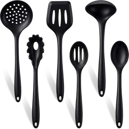 TeamFar Silicone Cooking Utensils Set of 6, Heat Resistant Kitchen Utensils, Spatula Ladle Spoon Pasta Server for Non-stick Cookware, Non-Toxic & One-Piece, Non-Scratch & Dishwasher Safe, Black