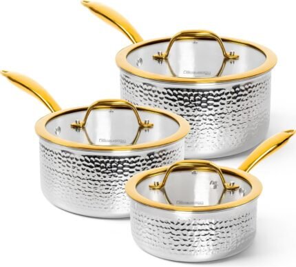 Michelangelo Triply Stainless Steel Saucepan Set, Luxury Hammered Stainless Steel Sauce Pans with Golden Handle, Premium Sauce Pot Set, Induction Compatible