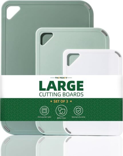 Plastic Cutting Board Set of 3-Cutting Boards for Kitchen BPA Free, Large-Small Chopping Boards Non-Slip for Cooking Camping Dishwasher Safe, Reversible, with Grip Handle, 15″×10″×0.6″ Green