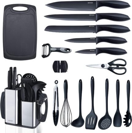 RAXCO Kitchen Utensils Set For Cooking-7 Cooking Utensils,5 Kitchen Utensils,6 Knife set,utensilios de cocina(18-in-1) (Black)