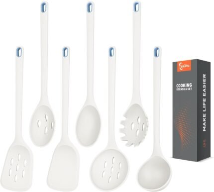 Large Silicone Utensils Set of 7 for Cooking,No Scratch for Nonstick Cookware,Pasta Server,Spaghetti Spoon,Slotted Spoon&Spatula,Solid Spoon&Spatula,Skimmer,Soup Ladle BPA Free Heat Resistant (White)