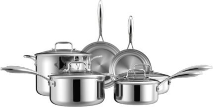 5-Ply 10 Pcs Stainless Steel Cookware Set, Pots and Pans Set, Frying Pans, Saucepans, Saute Pan and Stock Pot, Compatible with All Cooktops