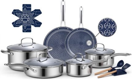 Blue Diamond Hybrid Nonstick Stainless Steel 12 Piece Cookware Set, Tri-Ply PFAS-Free Ceramic Diamond Bond Pots & Pans, Dishwasher & Oven Safe to 850F, Induction Ready, Metal Utensil Safe, Silver
