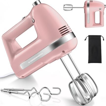 Electric Hand Mixer with Stainless Steel Whisk, Dough Hook Attachment and Storage Bag, Handheld Mixer for Baking Cakes, Eggs, Cream Food Mixers. Turbo Boost /5 Speed Kitchen Blender PINK