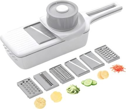 Mandoline Slicer for Kitchen with Drain Box, 6-in-1 Handheld Vegetable Slicer for Salad Prep, Cucumber & Cabbage Slicer with Safety Guard, Upgraded Long Handle Veggie Slicer for Easy Cleaning