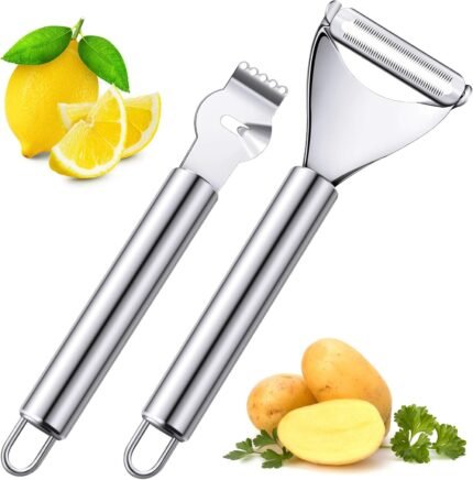 Price: (as of – Details) Product description Silver Lemon Zester Peeler, Stainless Steel Lemon Lime Orange Peeler with Knife Fruit