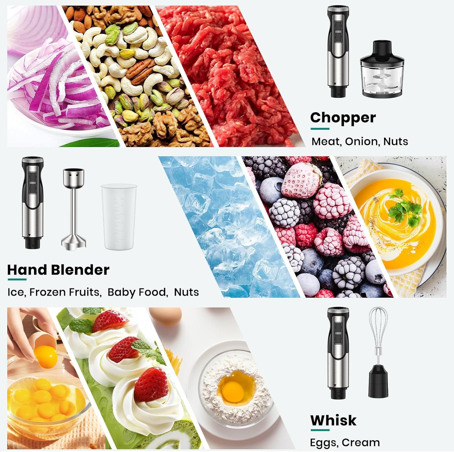 1800W Immersion Blender Handheld 4-in-1 Hand Blender Stick for Ice Crushing Smoothie, Baby Food, Soup, 8 Speed Hand Mixer Turbo Boost Stainless Steel Blade with Whisk, Chopper, Beaker