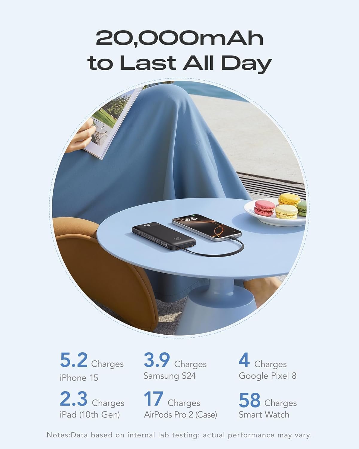 🔋Double the Capacity, JUST 35% HEAVIER: With twice the capacity of standard power banks, this 20,000mAh portable charger with built-in cords powers an iPhone 16 up to 3 times, Galaxy S24 up to 2.9 times, and Google Pixel 9 up to 2.3 times, perfect for weekends away, business trips, or vacations.(Note: This 77Wh power bank complies with airline carry-on regulations for batteries under 100Wh and must be placed in carry-on baggage.)