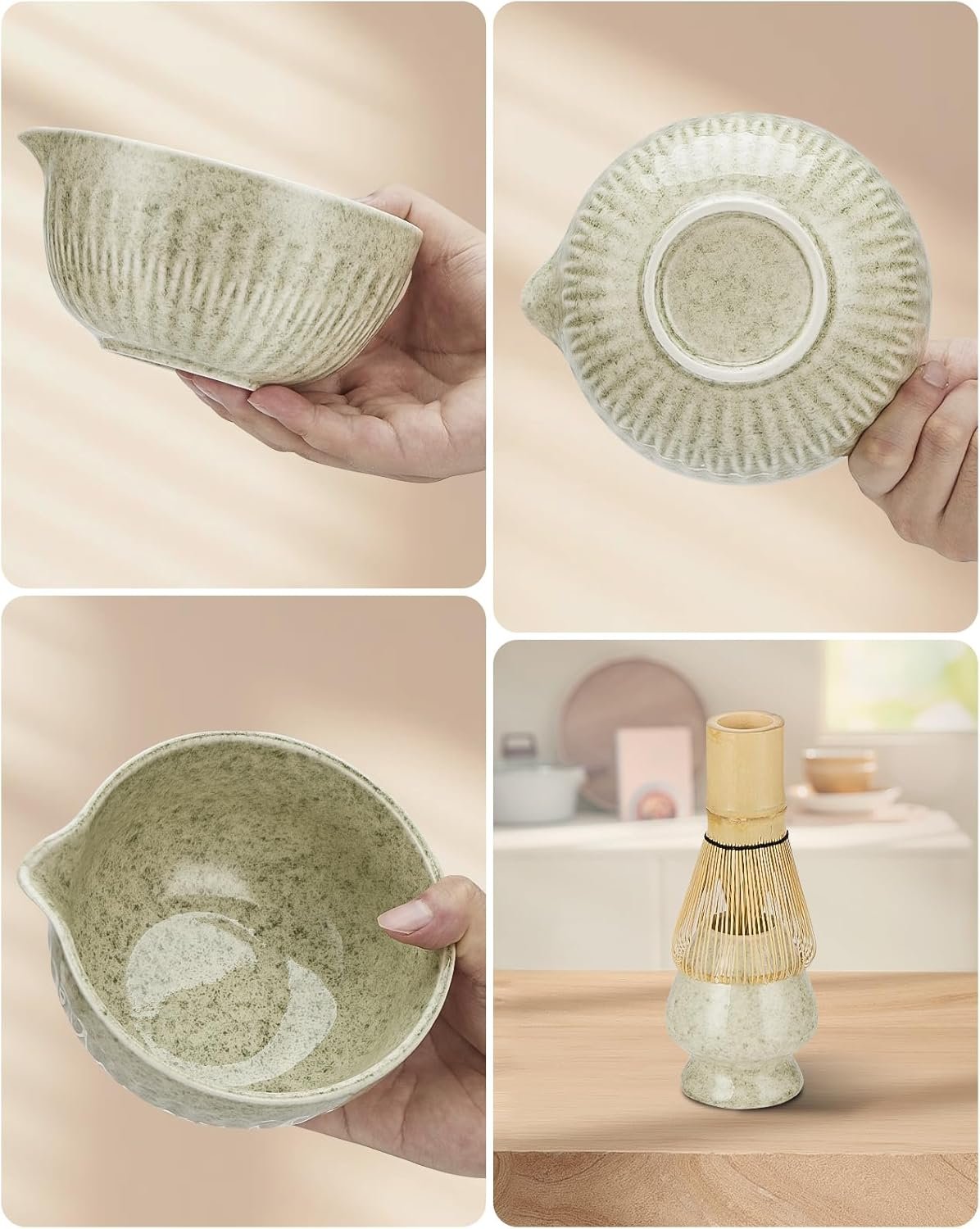 【7Pcs Matcha Whisk Set】This exclusive collection includes everything for an authentic matcha experience:1*Matcha Bowl 580 ml/20 Oz, 1*Bamboo Whisk, 1*Bamboo Scoop , 1*Cermaic Whisk Holder, 1*Ceramic Scoop Stand, 1*Cotton Tea Cloth and 1*Matcha Powder Sifter