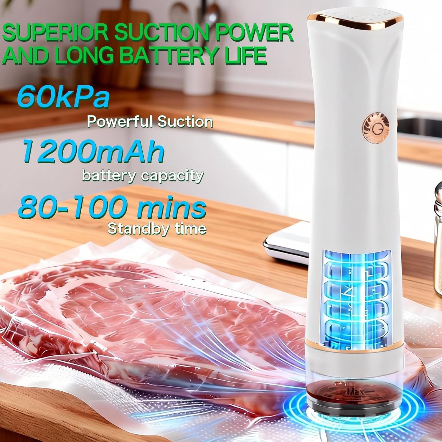 ⚡ 60kPa Powerful Suction & Auto-Stop:With 60kPa suction, this handheld vacuum sealer for food seals bags in seconds and stops automatically.Ultra-long 100-minute vacuuming time and a low noise level of 55 decibels improves your efficiency in keeping food fresh.Tip: Use the included clips to pre-seal bags for optimal results!