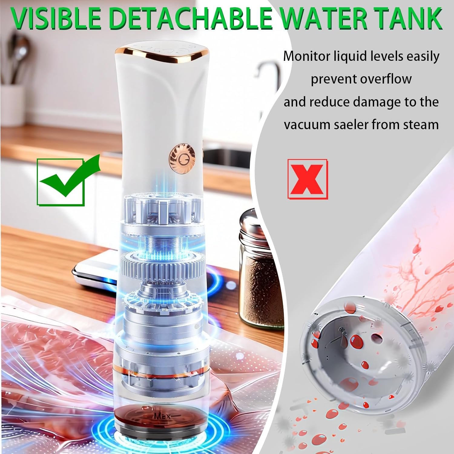 ✨ Complete Kit with Visible Detachable Water Tank: Upgraded vacuum sealer kit includes: vacuum sealer*1, reusable BPA-free bags*16 (Midum*8,Large*8), clips*2, Mason jar seal converter*2 ,Mason lids*20(regular mouth*10,wide mouth*10),lid opener*1,stopper*1, sticker labels*24 , and a charging cable. With visible water tank you can monitor liquid levels, prevent overflow, and reduce damage to the vacuum saeler from steam.