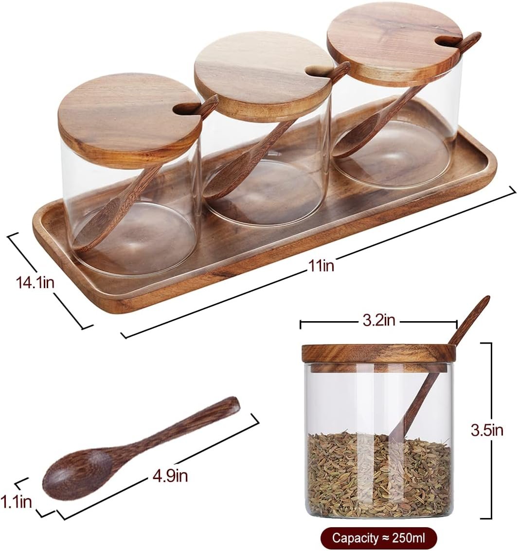 3 Pack 250ml / 8.5oz Clear Glass Spice Jar with Acacia Wooden Lid and Spoon, Classic Style, Kitchen Storage Container, 3.2 inches (diameter) x 3.5 inches (height)