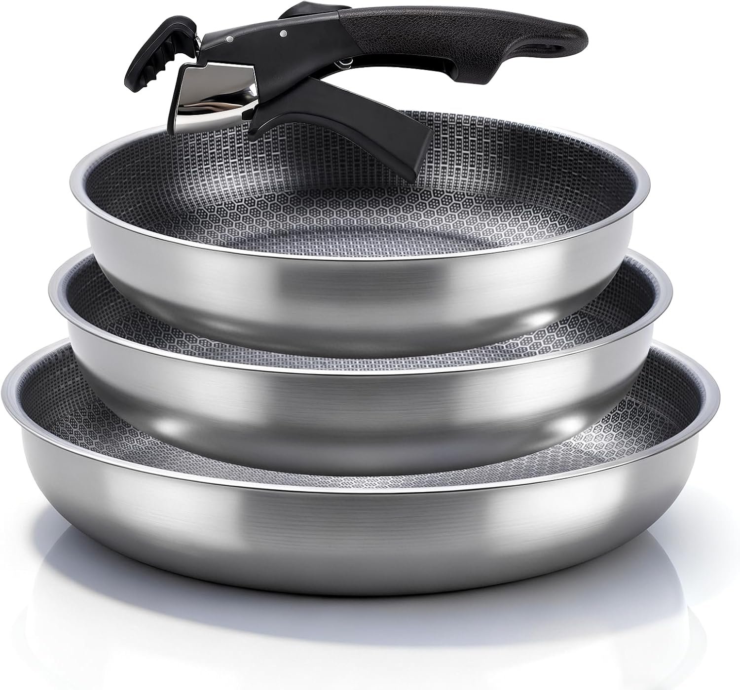 VERSATILE SET: This versatile 3-piece stainless steel frying pan set is designed to handle all your cooking needs with exceptional convenience and performance. The set includes three different sized skillets that nest together for compact storage, making it perfect for kitchens of any size