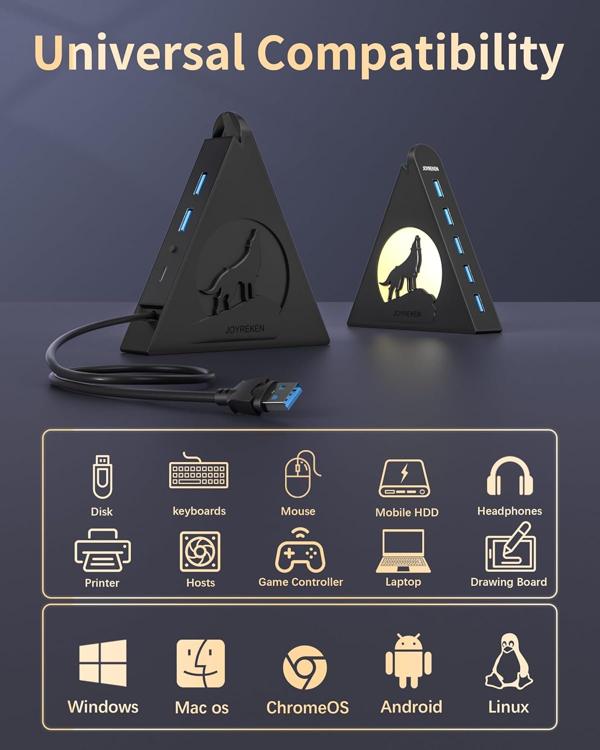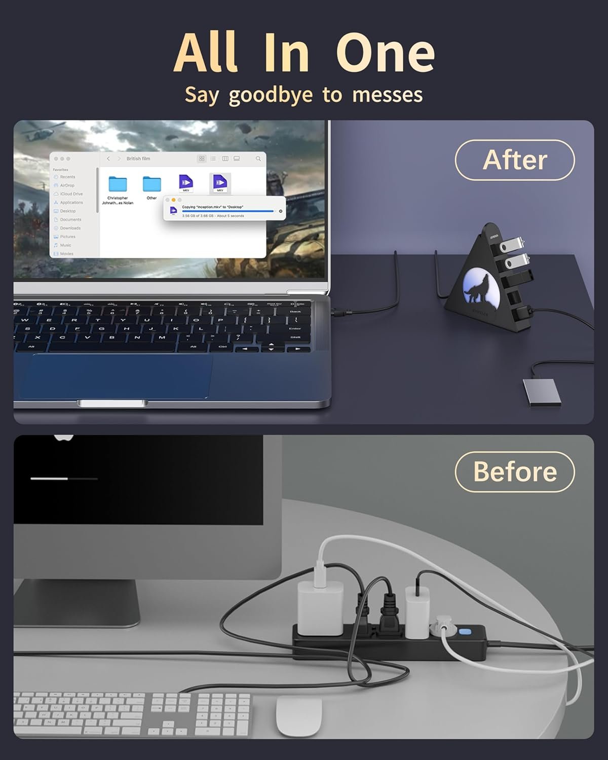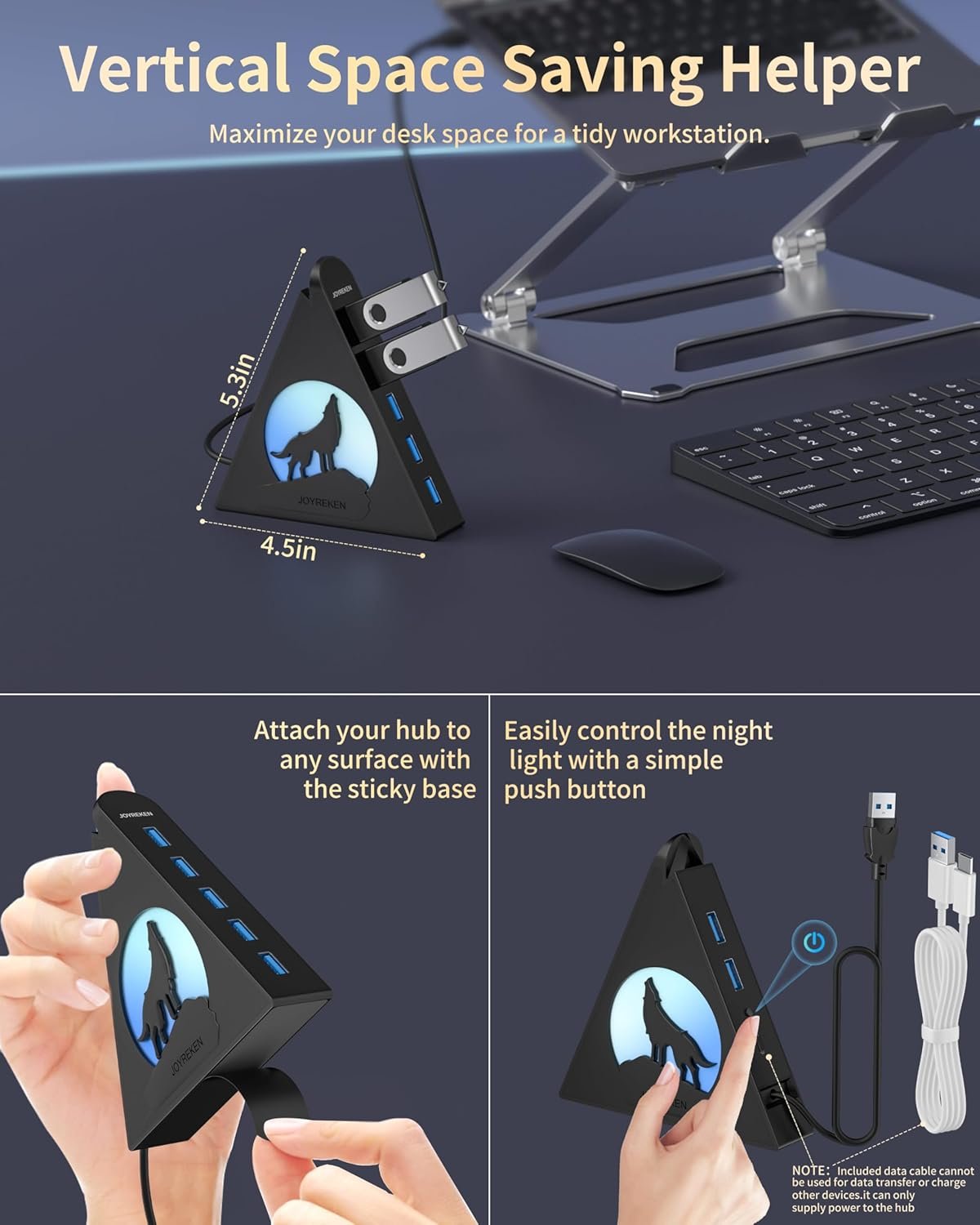【RGB Lighting with Unique Triangular Design】Note: Please push the button once to turn on/off the night light on the side.Bring energy to your workspace with this stylish rgb usb hub, featuring a vivid wolf-head pattern that cycles through 7 colors. Its triangular, modern form fits perfectly into any desktop usb hub layout while also doubling as a visual centerpiece. The vertical design helps conserve desk space—making it a standout usb hub tower for users who want flair with function. It also includes double-sided adhesive so you can mount it wherever works best.