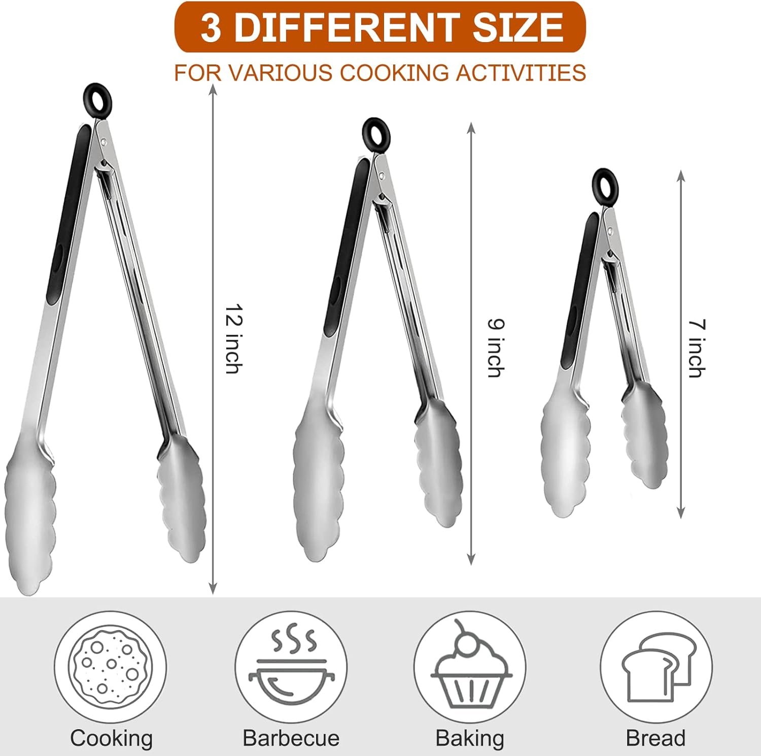 WHAT YOU GET: The whole package comes with 9 stainless steel kitchen tongs, including 3 pieces of 7″ kitchen tongs, 3 pieces of 9″ kitchen tongs and 3 pieces of 12″ kitchen tongs, perfect for your various cooking needs.