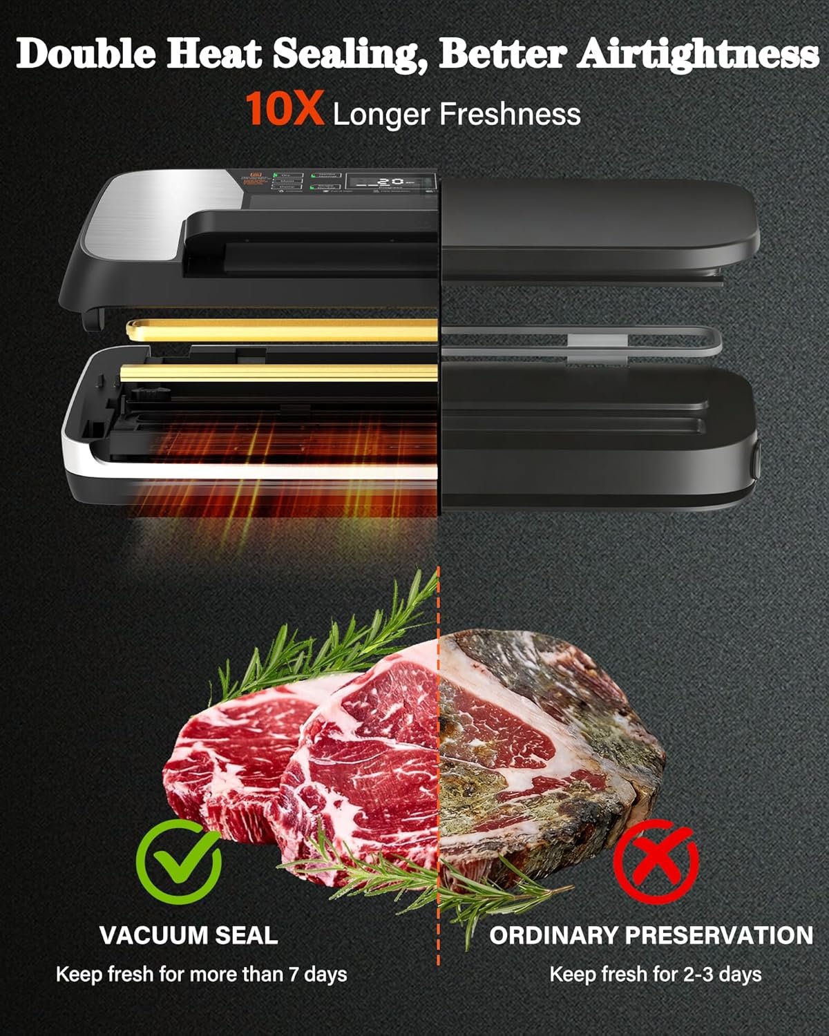 【Extend Freshness 10x】Our Vacuum Pack Machine double-layer heat seal (12.5mm wide) with silicone gasket creates an airtight lock. Perfect for weekly meal prep, saving leftovers, and long-term freezer storage—no freezer burn, no waste.
