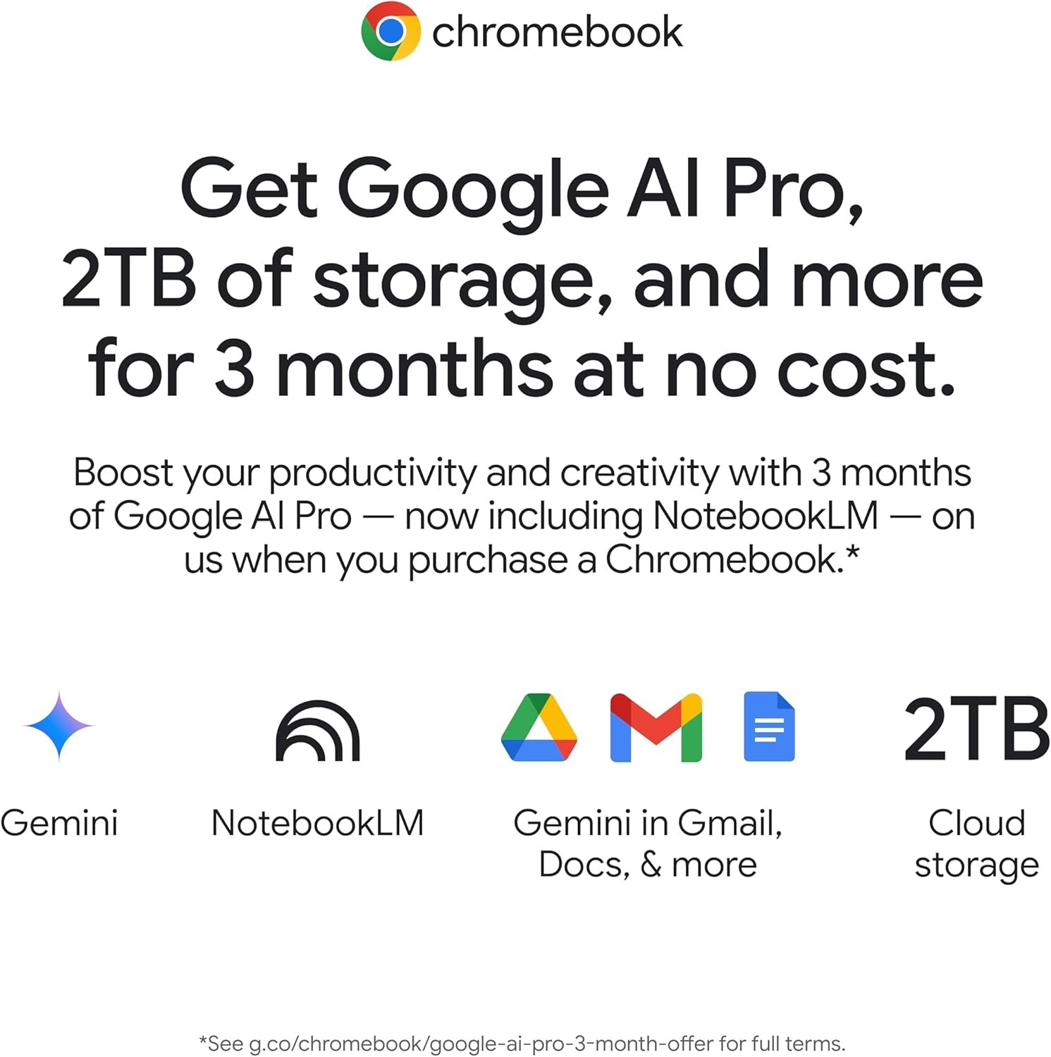 Get Google AI Pro, 2TB of Storage, and More for 3 Months at No Cost: Boost your productivity and creativity with 3 months of Google AI Pro — now including NotebookLM — on us when you purchase a Chromebook.(1)