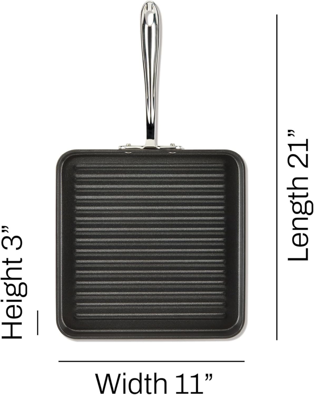 The HA1 Hard Anodized Nonstick 11 inch Square Grill features an open surface with low walls for easy flipping and raised ridges for capturing beautiful searing marks and releasing fat.