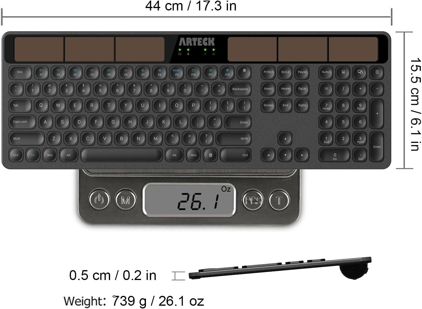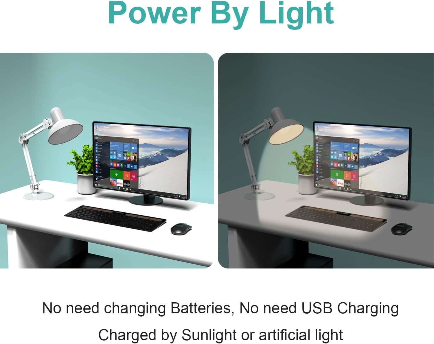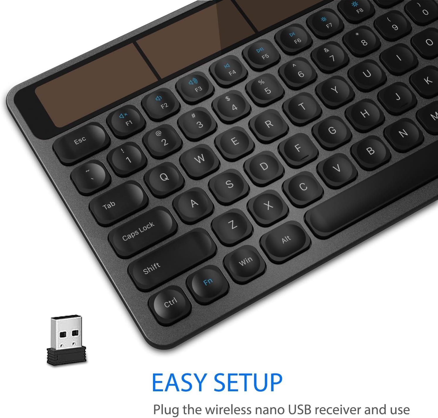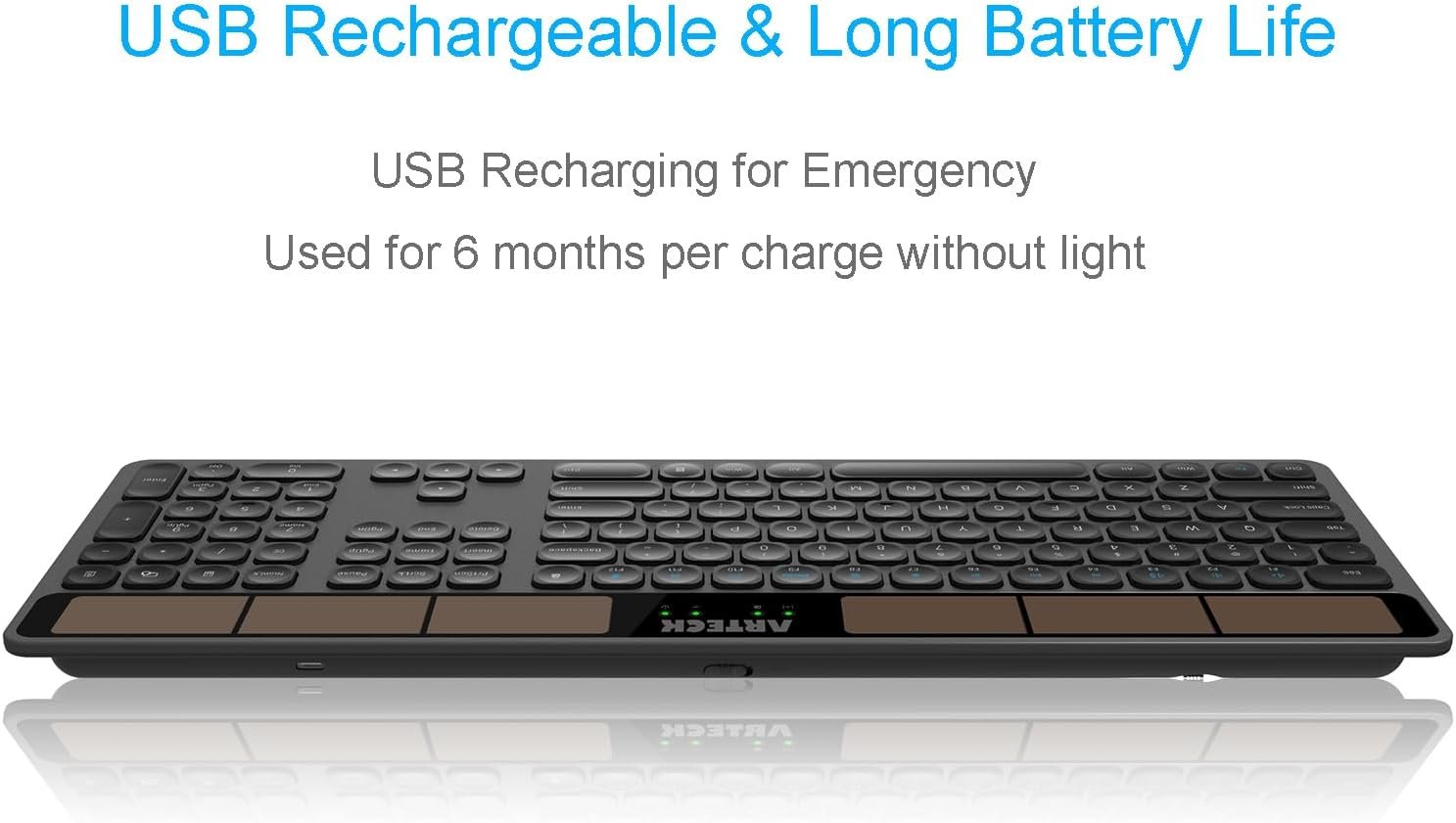 Solar-Powered Keyboard: No battery hassle or cable charging hassle. Any light source keeps your keyboard recharging while working or not working.