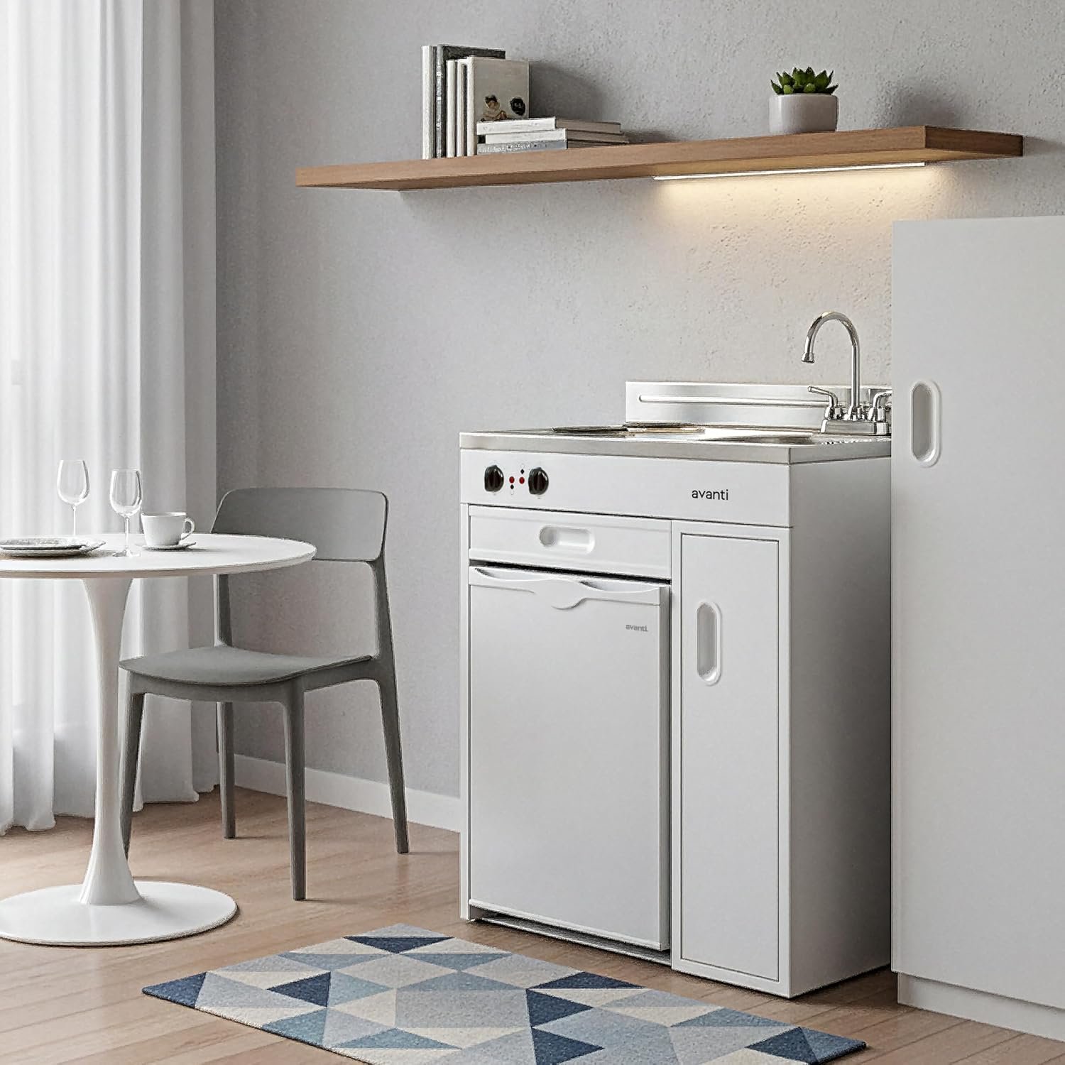 Solve small kitchen space problems with the 30″ compact kitchen from Avanti. This all-in-one kitchenette with stainless-steel countertop, backsplash, and sink, two-element electric coil cooking range, built-in, refrigerator, and separate storage drawer and cabinet. It’s perfect for the hotel room, office, bar, studio apartment, tiny home, rental room, condo, vacation home, or anywhere kitchen space is a premium. The mini-fridge features two adjustable/removable wire shelves, built-in door bins, and a reversible door. The full range temperature control and automatic defrost system ensures your food and beverages stay fresh and cold throughout the day.