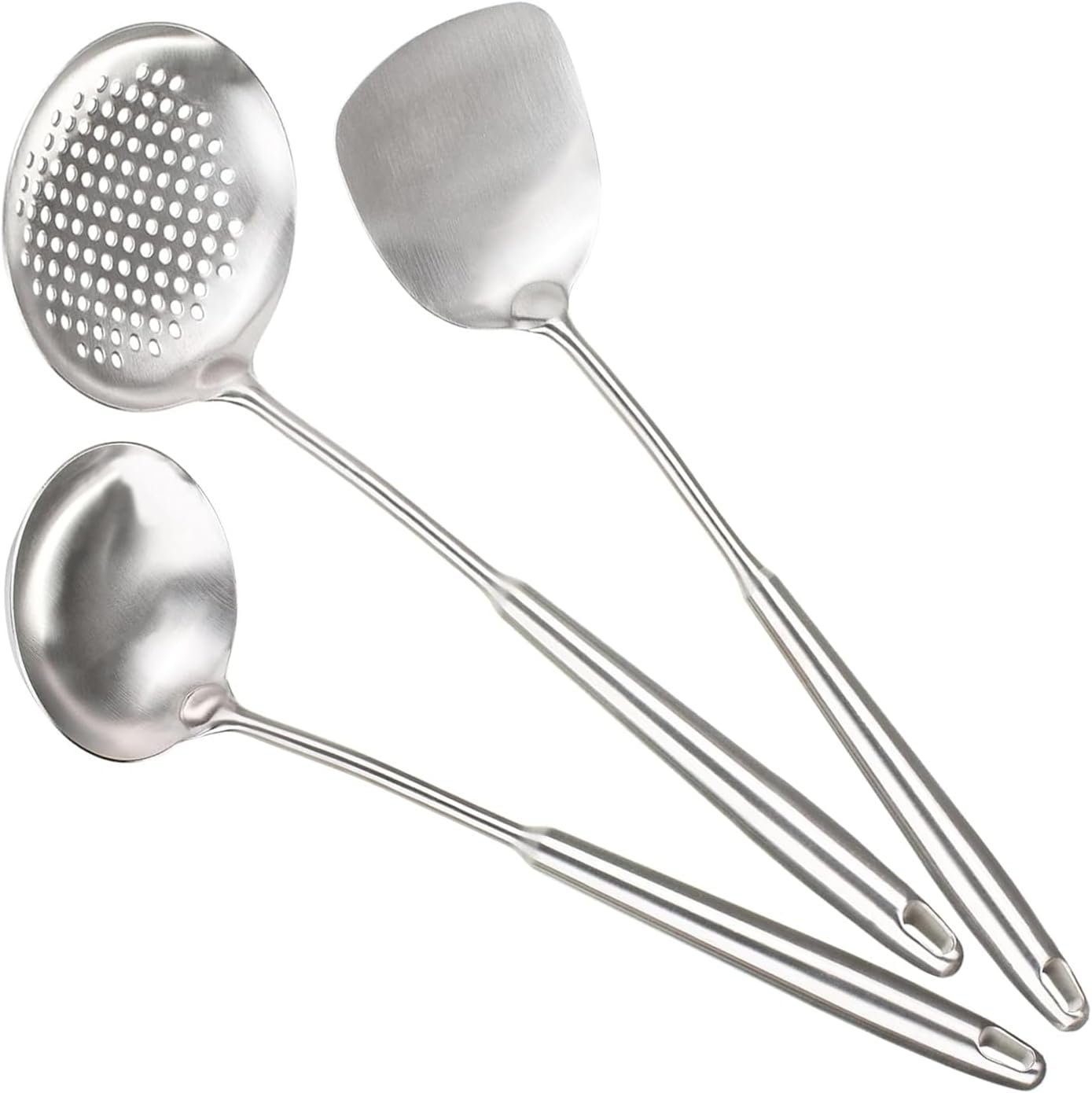 Berglander Wok Spatula Set of 3, Stainless Steel Kitchen Utensils Set, Stainless Steel Cooking Utensils Set, 17″/43.5cm Heat-Resistant Wok Tools Include Stainless Steel Metal Spatula, Metal Kitchen Ladle, Metal Cooking Skimmer, Wok Utensils and Wok Accessories