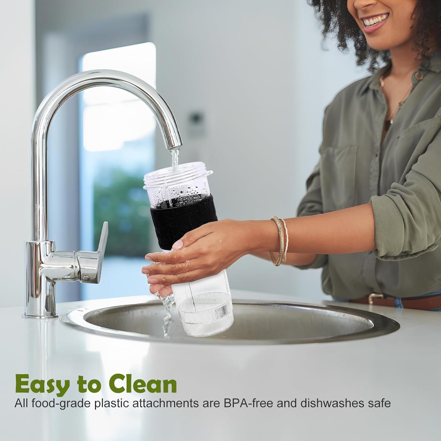 [Blender/Chopper/Grinder] Compact blender contain: 1*700W motor, 1*570ml(19oz) portable blender bottle, 1*unleaking lid, 1*1500ml(50oz)food chopper and 1*300ml(10oz) coffee grinder. Great for on the go, small kitchen or just saving space, very convenient.