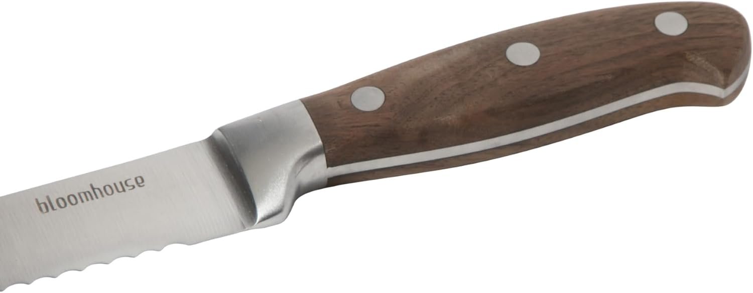 Favored in home and professional kitchens, high-quality German steel cutlery yields a variety of cuts and textures – from mincing aromatics, dicing vegetables to filleting fish and chopping prime steaks. Suitable for everyday use, a German steel knife is rust-resistant and easy to clean, sharpen and maintain. The bloomhouse® German Steel Bread Knife is forged with a purpose – to cut through thick crusts and pillowy crumbs with sharpness and precision. The full-tang blade provides balance and even weight distribution to reduce pressure and wrist fatigue. Each handle is crafted from rich walnut wood to blend rustic design and lasting durability. As a nod to our Earth’s beauty and resilience, the wood handle features a rustic grained pattern iin a natural, deep brown color to add character to the knife. Stainless steel rivets secure the handle and the knife for a strong grip and improved control. Hand wash only. Keep the knife in the protective canvas sheath for safe storage and protection when not in use.