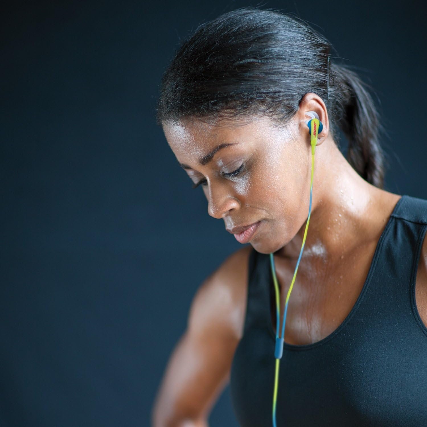 With neon blue color accents, the Bose SoundSport in-ear headphones provide rich sound and a secure comfortable fit designed for Apple devices.