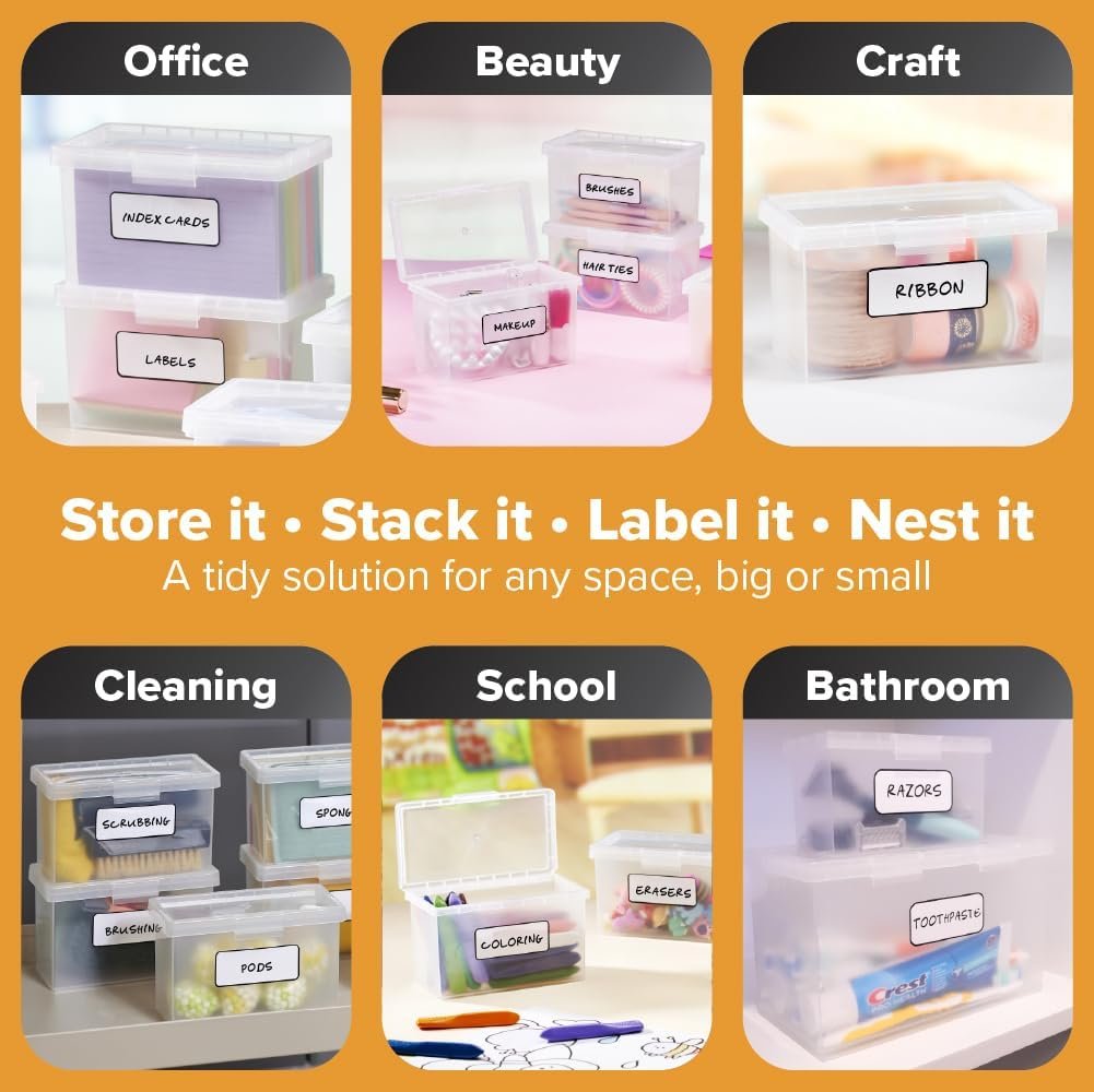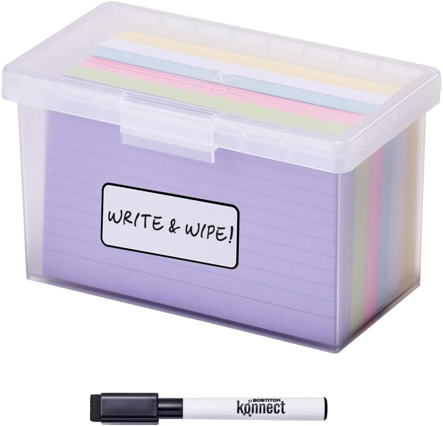 Is clutter ruling your world? Take back control with the Konnect clear stacking storage boxes! These versatile boxes can be used in the office, classroom, bathroom, and every room in between. Forget separate covers that disappear the second you take them off the box, Konnect clear stacking boxes have an attached cover that you’ll never lose. Firm latches ensure anything you store stays secure. The ultra-clear plastic construction and write+wipe adhesive labels make it easy to quickly find what you’re looking for. Easily fits any 3×5 cards such as index cards, recipe cards, and small greeting or thank-you cards