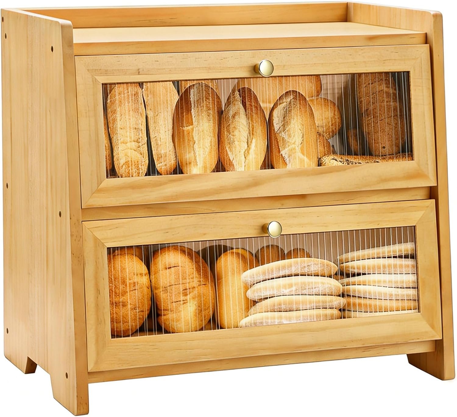 🥖DOUBLE LAYER WOODEN BREAD BOX FOR MAXIMIZE COUNTERTOP STORAGE – This bread box for homemade bread features a smart double-layer design that doubles your storage space without taking up extra countertop area. Keep your kitchen organized and clutter-free—no more messy bread bags or crushed pastries. It fits most standard kitchen countertops, making it ideal for small apartments, families, or anyone who loves fresh bread daily.