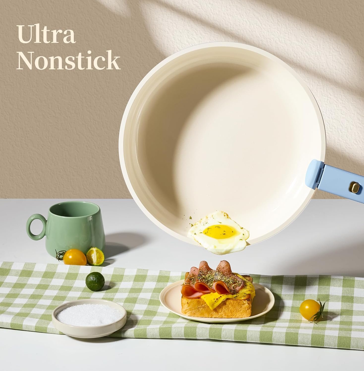 Nonstick Ceramic Coating: Made of natural ceramic, our kitchen cookware set is free of PFAS, PFOA, PFOS and the other harmful chemicals. You can enjoy your cooking on this cookware set safely & easily