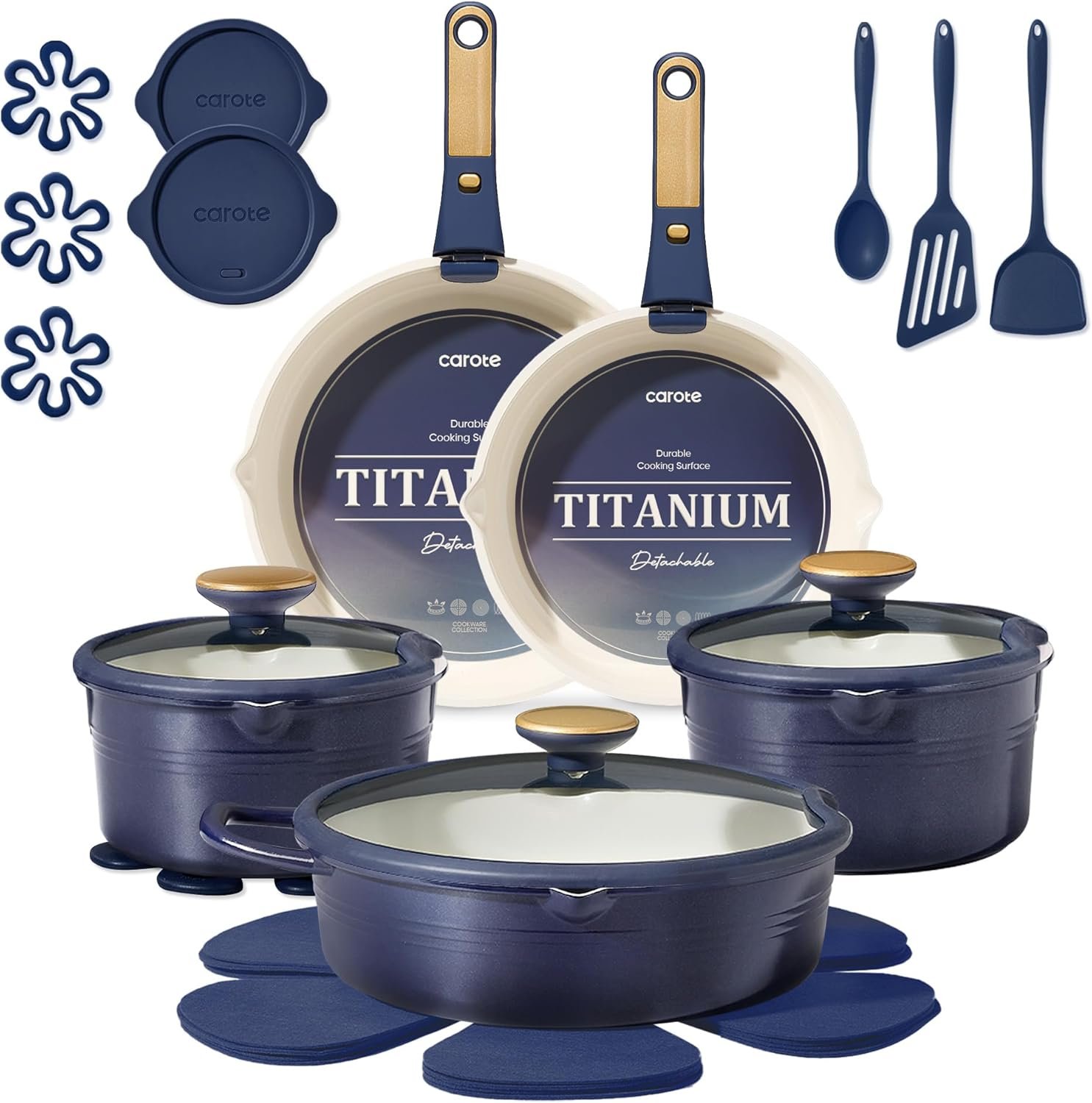 CAROTE 22Pcs Titanium Cookware Set, Pots and Pans Set Non Stick, Kitchen Cooking Set with Detachable Handle, Non Toxic Induction Cookware, Dishwasher/Oven Safe,Blue
