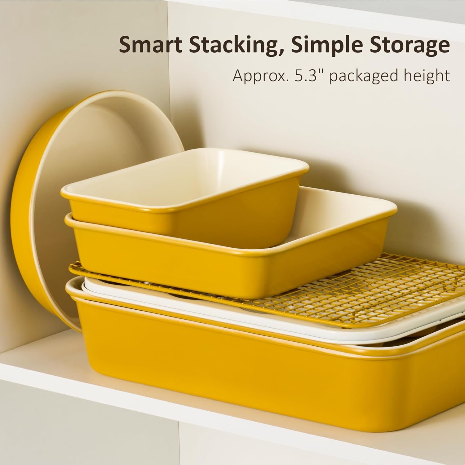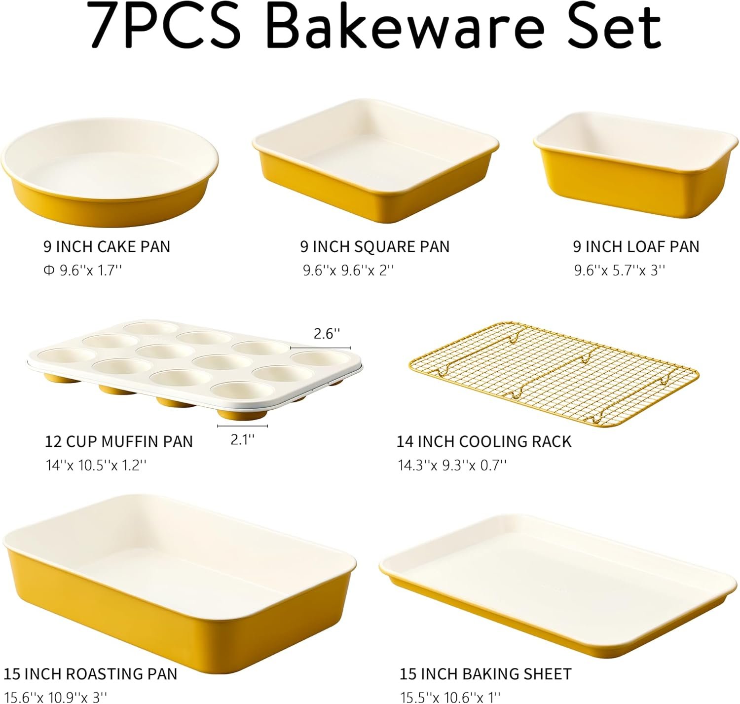CAROTE 7-Piece Nonstick Ceramic Baking Pans Set – Bakeware Sets Including Cookie Sheets for Baking, Muffin Pan, Bread Pan, Cake pan, Loaf Pan, Roasting Pan, and Cooling Rack, Yellow & White