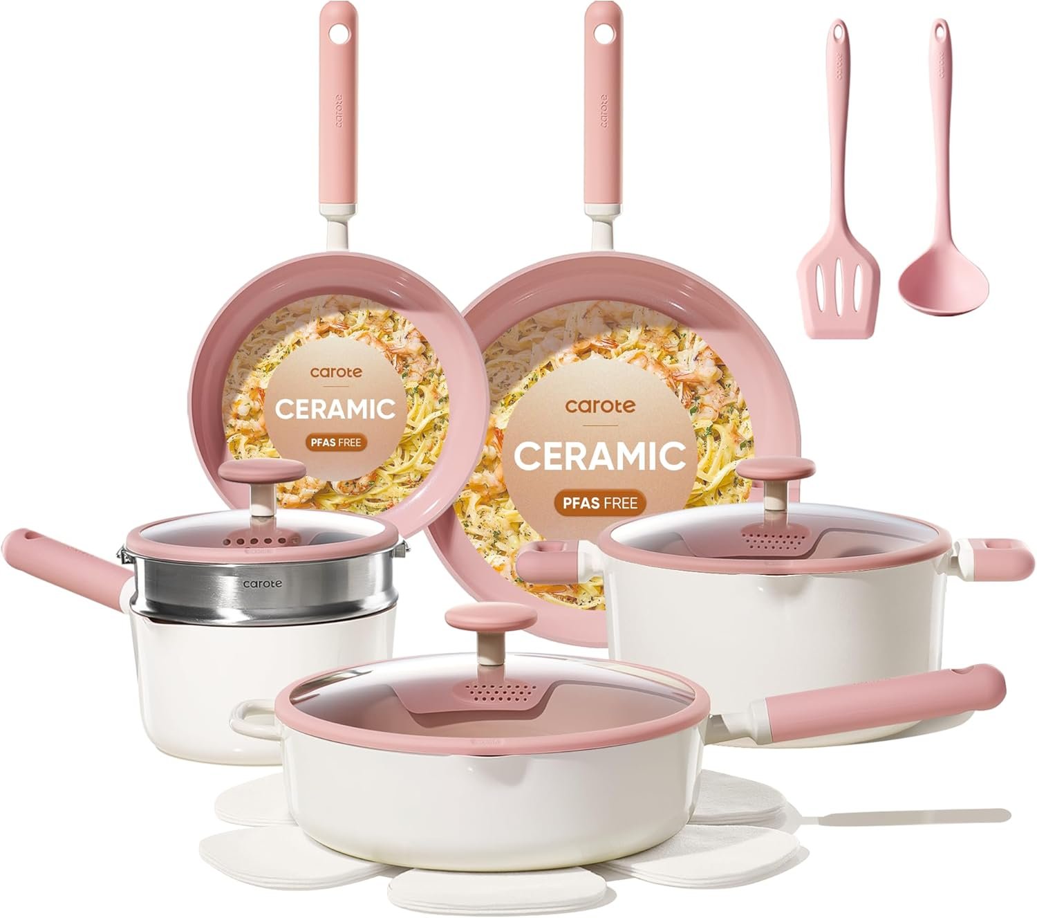 CAROTE Ceramic Cookware Set Nonstick, 15pcs Pots and Pans Set Non stick, Non Toxic Cookware,Dishwasher,RV/Camping Cookware Set, Pan and Pot with Kitchen Utensils, Pink